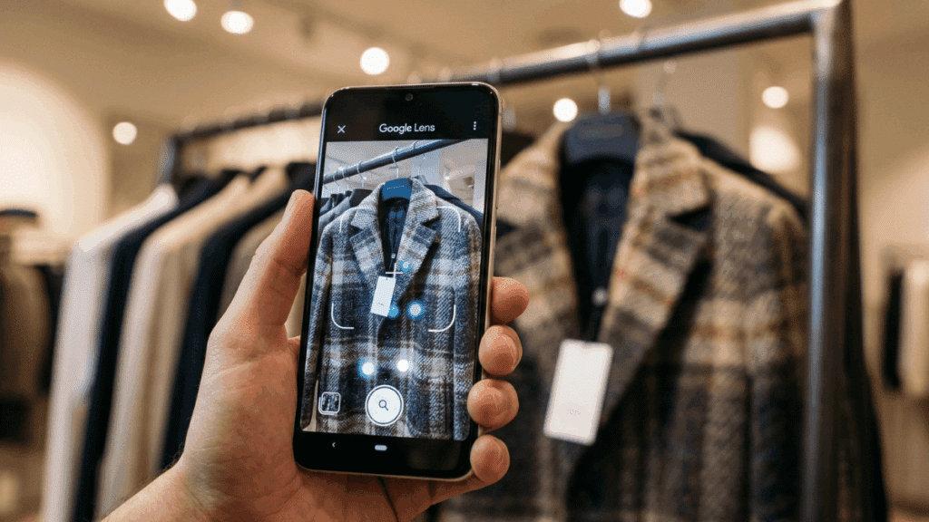 Google Lens is the most powerful general-purpose visual search tool available, and it works as well for fashion as it does for anything else. No upload required. Open the app, point your camera at a piece of clothing, and tap the shutter. Google highlights what it detects and returns links to matching products across e-commerce sites.